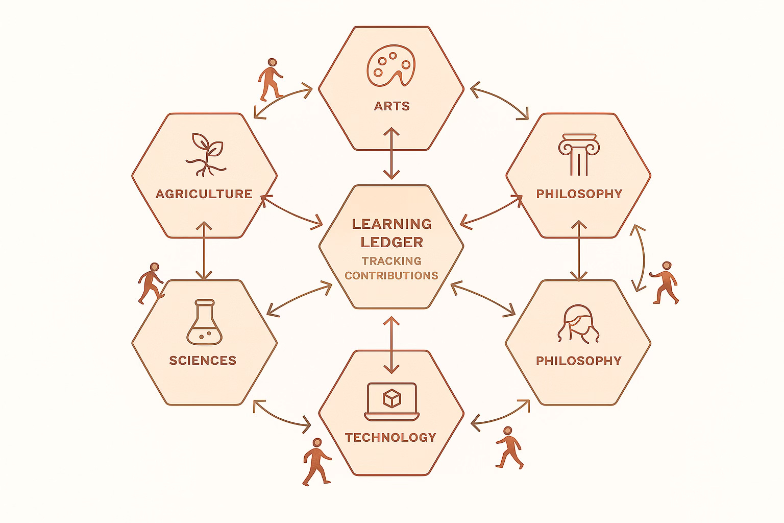 Evolved from Kerala’s existing alternative schools like Sarang and Pallikoodam, which emphasize experiential learning and community engagement, every resident above age 12 receives a “Learning Ledger”—a blockchain-verified record of knowledge created, shared, and validated by peers.